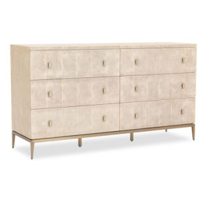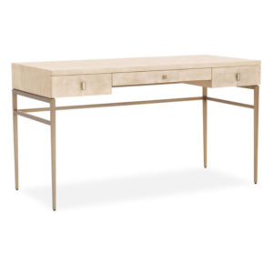 The Solange Collection is probably one of my favorites for this season. It’s the perfect mix of classic and modern, and the pebbled leather texture made from stingray skin impressions is so unique! I love the light shade of the finish; it’s subtle enough so as not to clash with other pieces of furniture, but the signature red lacquer pop of color found within each drawer’s interior keeps it fun. You can purchase desks and drawers of varying sizes in the Solange collection, so your whole room will tie together effortlessly. The champagne-brass framework on these pieces is a beautiful detail as well. This collection is long-lasting, affordable, and environmentally friendly. What more could you want?